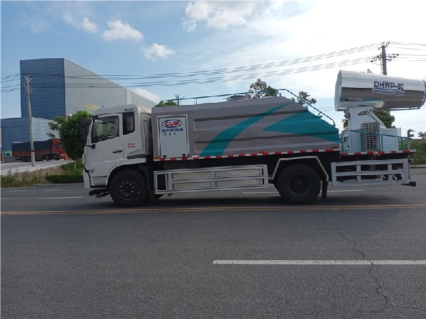我公司方罐抑尘车标配:前对冲、后洒、侧喷、后置式工作平台、平台上有高压水炮(可 360°旋转,可调成柱状**射程 35 米,也可调成雾状**射程 15 米,(可调成: 直冲状、大雨、中雨、小雨、毛毛雨),配备优质大功率专用洒水泵,取力器,杂物过滤网,国标通用 65 型消防接口(可通过消防栓加水),2 根引水胶管。水泵、取力器、球阀、滤网均为**标准产品,主管道加粗,法兰垫、法兰盘加厚,前对冲,大通径球阀,具有性能优良,工作可靠、效率高、流量大。尾部加装雾炮能有效的对雾霾、灰尘进行有效的抑制效果。