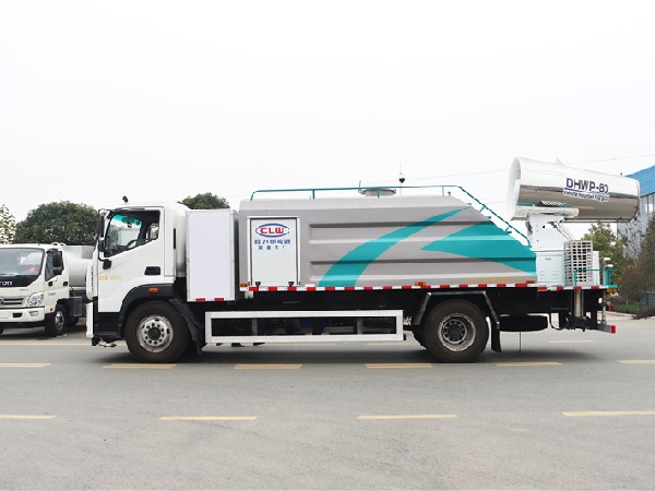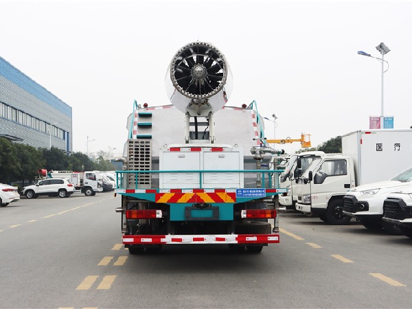 我公司方罐抑尘车标配:前对冲、后洒、侧喷、后置式工作平台、平台上有高压水炮(可 360°旋转,可调成柱状**射程 35 米,也可调成雾状**射程 15 米,(可调成: 直冲状、大雨、中雨、小雨、毛毛雨),配备优质大功率专用洒水泵,取力器,杂物过滤网,国标通用 65 型消防接口(可通过消防栓加水),2 根引水胶管。水泵、取力器、球阀、滤网均为**标准产品,主管道加粗,法兰垫、法兰盘加厚,前对冲,大通径球阀,具有性能优良,工作可靠、效率高、流量大。尾部加装雾炮能有效的对雾霾、灰尘进行有效的抑制效果。
